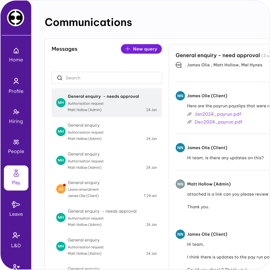 Say goodbye to missed information and last minute chasing. Pay run is automatically compiled from different data points in the platform. You can easily run checks, make final approvals or declines, upload amendments, and action any pending tasks—all from one place. Once ready submit it with just a click.